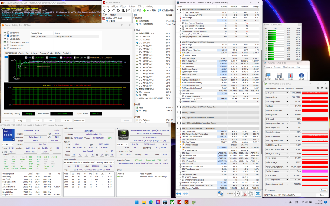 显卡功耗85W,温度88.8℃撞墙,频率1785MHz。