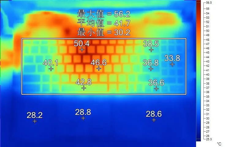 表面温度如上图所示,键盘键帽最高50.4℃出现在数字“6”键上,WASD键附近约为40.1℃,方向键36.6℃。左腕托温度为28.2℃。