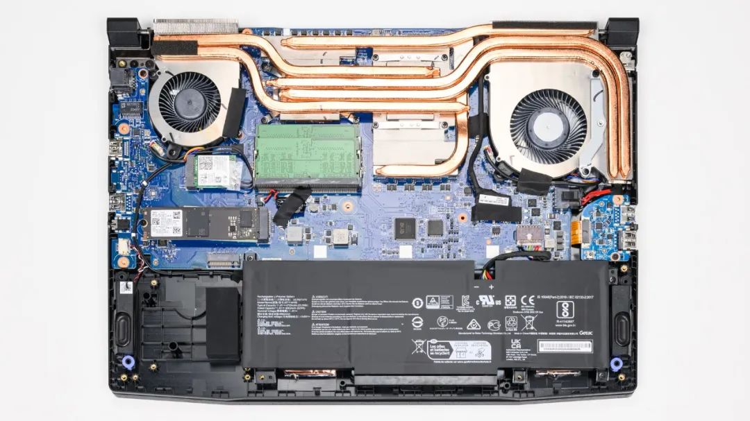 上图是微星 星影15的拆机实拍图,六热管双风扇的组合,电池左侧有个M.2硬盘位,但没有固定螺柱,你只能通过“夹住”或者“粘住”的方式固定它。