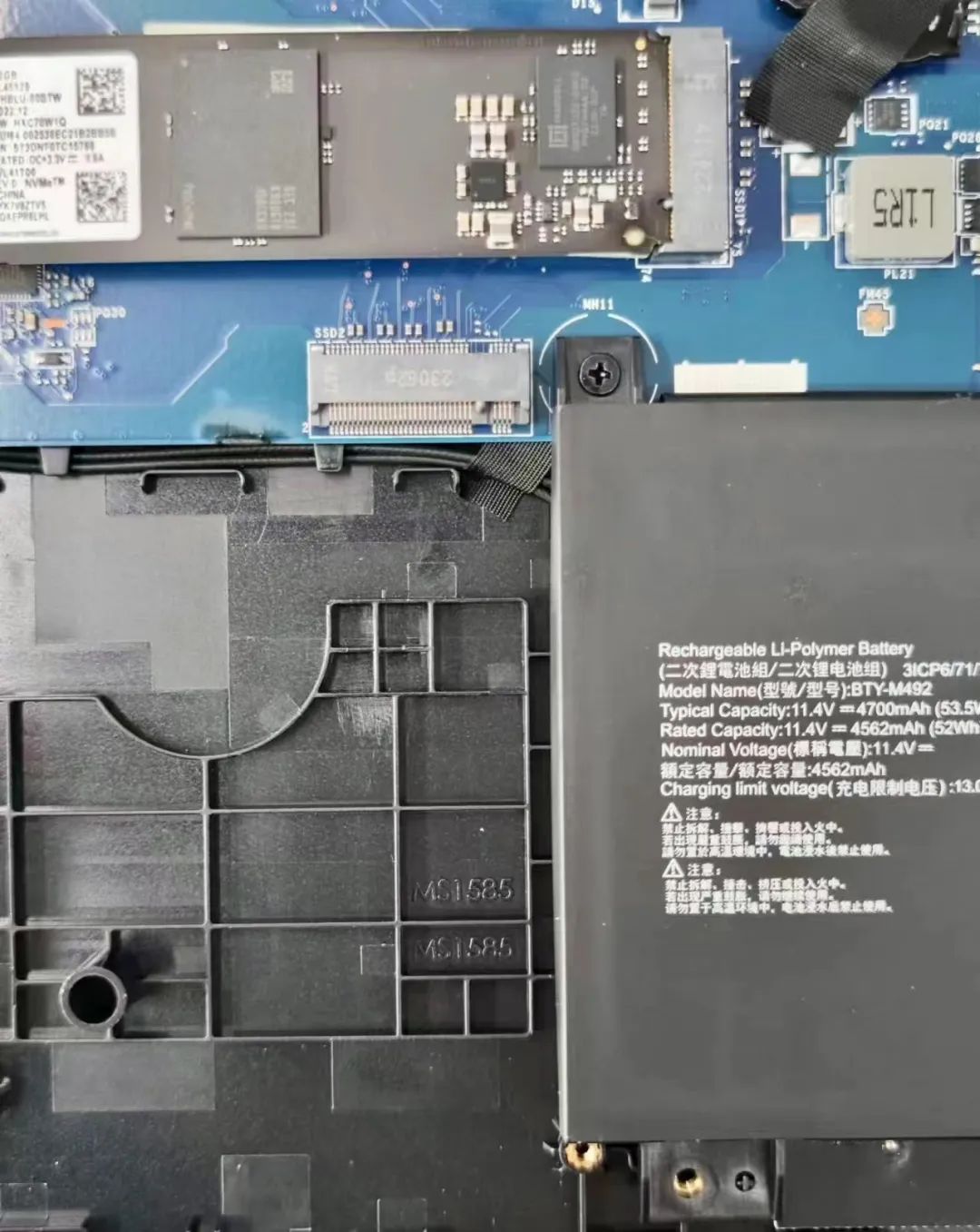它是有双M.2槽位的,但是第二个M.2槽位被设计在电池边上,没有螺丝固定(看下图),安装固态后需要另外想办法固定,这一点是让我最不能忍的。