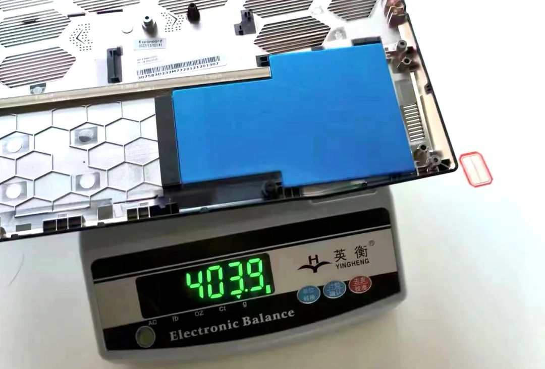 这台机器的D壳上拥有一块无法拆卸的配重金属块(看下图),对应位置为C面硬盘位,经过实测D壳+配重块的重量高达403.9g,相比之下,普通游戏本的塑料底壳重量在250g左右,有150g的重量出入。