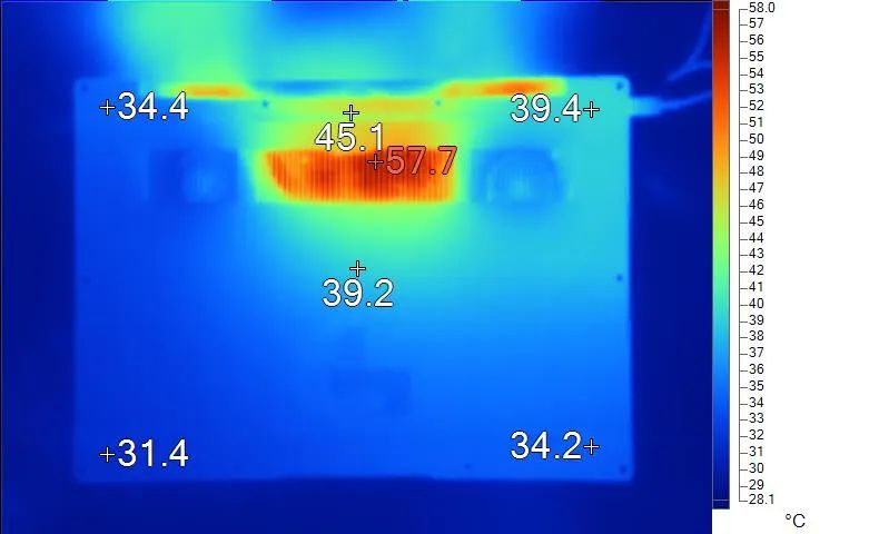 表面温度如上图所示,键盘键帽最高43.7℃出现在键盘顶部数字键区域,WASD键为39.8℃,方向键30.5℃。左腕托温度为33.6℃,背面中心点39.2℃。