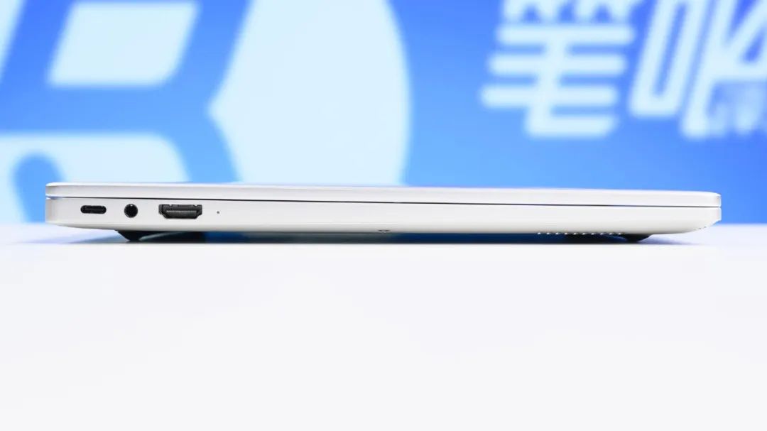 接口方面,机身左侧依次为USB-C 5Gbps(支持PD充电与视频输出)、3.5mm音频接口、HDMI1.4b;