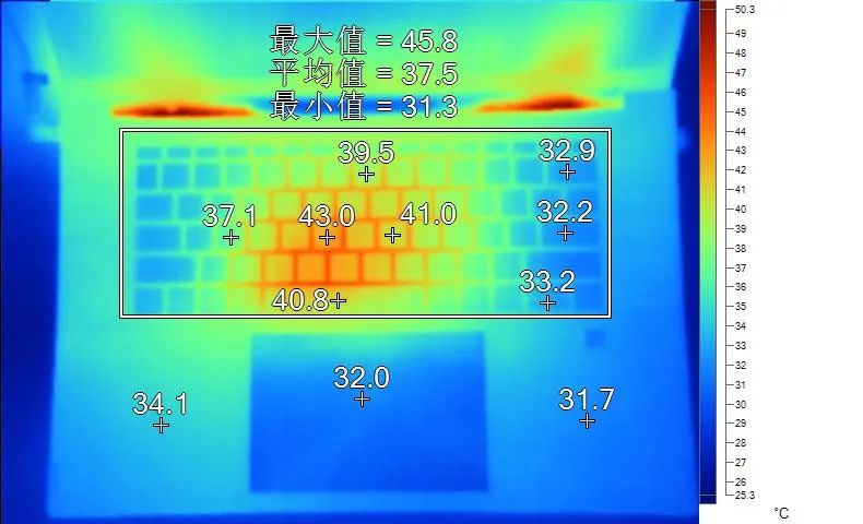 表面温度如上图所示,键盘键帽最高43.0℃出现在“G”键上,WASD键附近约为37.1℃,方向键33.2℃。左腕托温度为34.1℃。