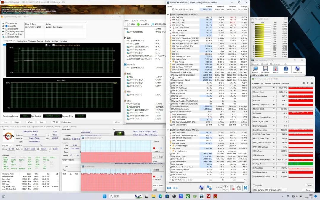 显卡从RTX4090缩减到RTX4070,但表面温度并没有显著降低,对于4070这个级别的电脑来说,这个表现没有高配版那么惊艳。