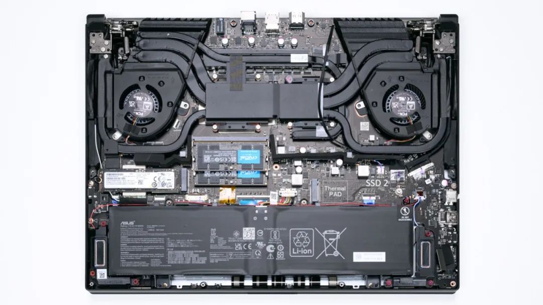 上图是ROG 冰刃7 双屏的拆机实拍图,五热管双风扇的组合。