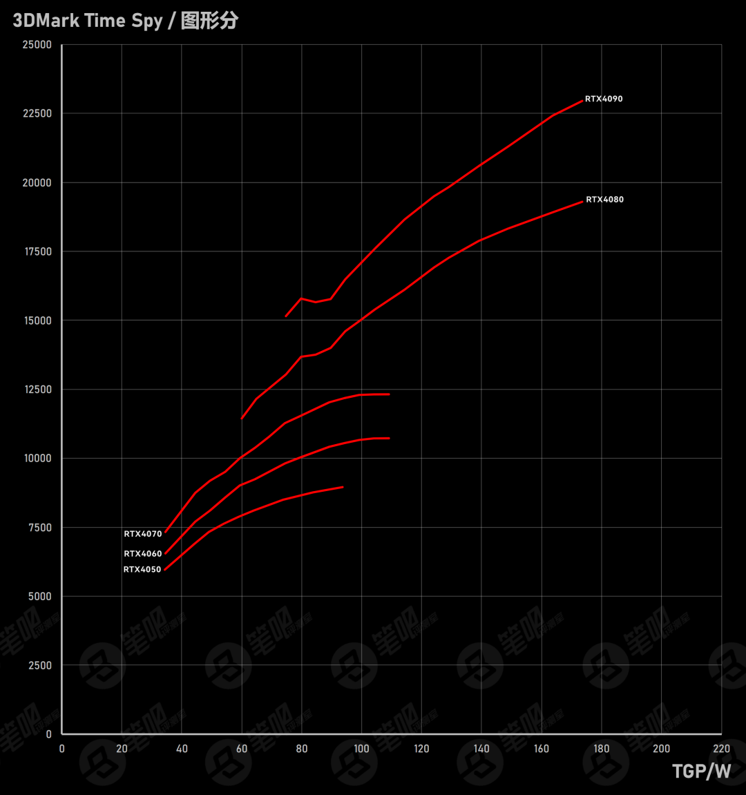 上图是我们做的显卡能效比曲线图,可以看到RTX4070和RTX4080/90的差距有多大。
