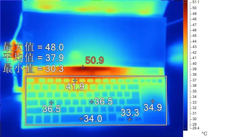 表面温度如上图所示,键盘键帽最高41.9℃出现在功能键“F5”键上,WASD键附近约为36.5℃,方向键33.3℃,右侧触摸板中心34.9℃。