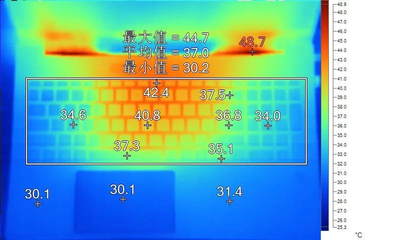 表面温度如上图所示,键盘键帽最高42.4℃出现在“F9”键上,WASD键附近约为34.6℃,方向键35.1℃。左腕托温度为30.1℃。
