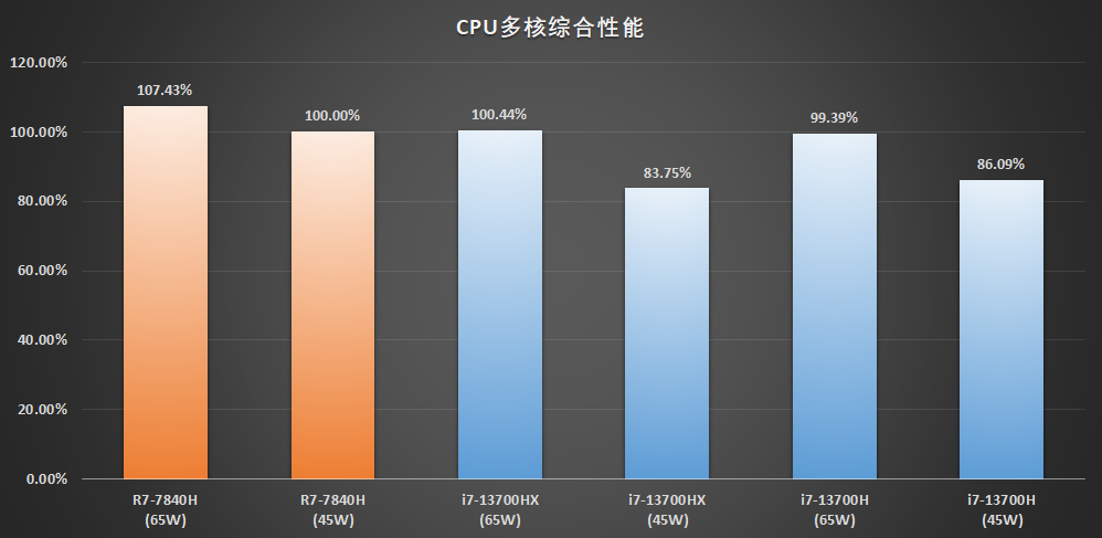 从图中成绩可以看到,R7 7840HS作为使用了5nm工艺的Zen4处理器,对功耗的要求并不高,45W时就能发挥65W时93%的性能。