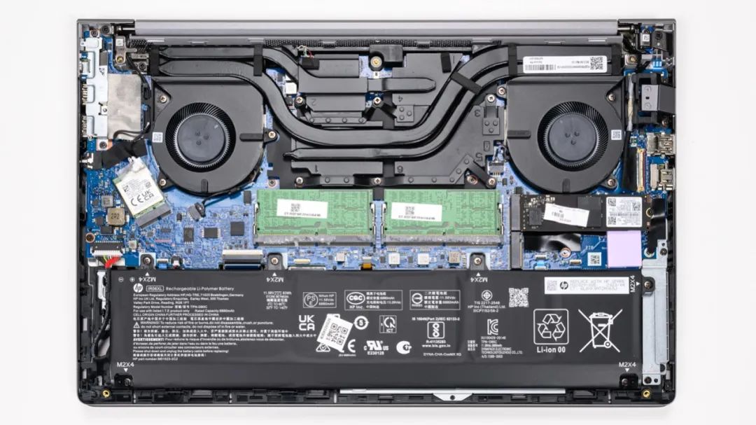 上图是惠普 战99 锐龙版的拆机实拍图,三热管双风扇的组合。
