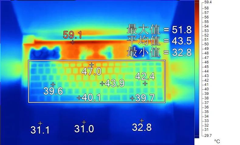 表面温度如上图所示,键盘键帽最高47.0℃出现在功能键“F9”键上,WASD键附近约为39.6℃,方向键39.7℃。左腕托温度为31.1℃。