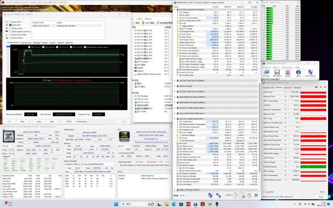 总的来说,ALIENWARE m18的散热表现一般,可能是由于厚度被压薄的关系,键盘高温面积比较大,且右侧热风吹手也会影响使用体验。