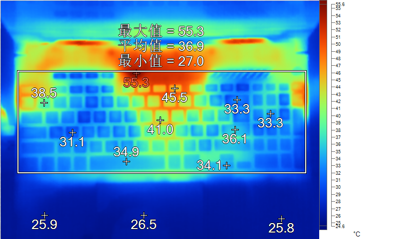 表面温度如上图所示,键盘键帽最高45.5℃出现在键盘F键区域,为,WASD键附近约为31.1℃,方向键34.1℃。左腕托温度为25.9℃。