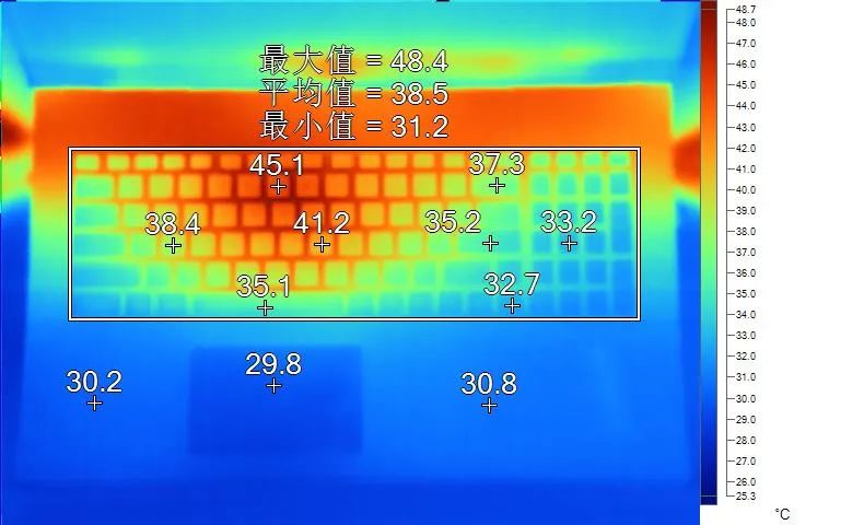 表面温度如上图所示,键盘键帽最高45.1℃出现在数字“6”键上,WASD键附近约为38.4℃,方向键32.7℃。左腕托温度为30.2℃。