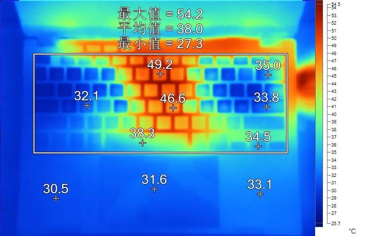 表面温度如上图所示,键盘键帽最高49.2℃出现在数字“7”键上,WASD键附近约为32.1℃,方向键34.5℃。左腕托温度为30.5℃,背面中心温度为43.7℃。