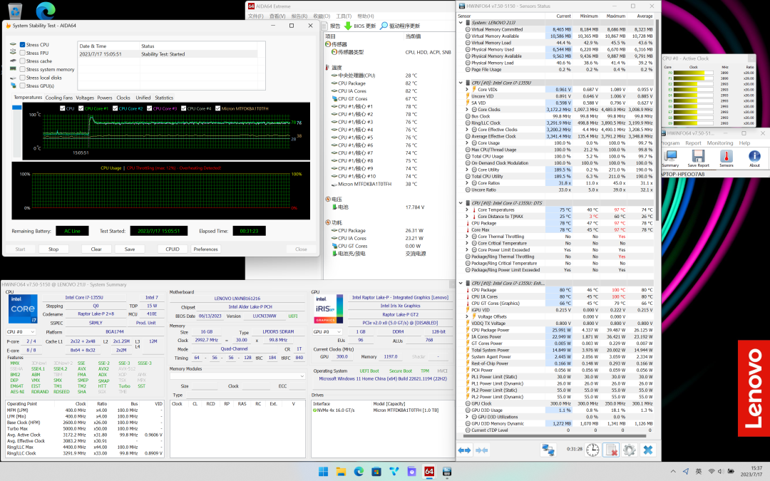 使用负载更高的Stress FPU测试,CPU温度最高78℃,稳定在78℃,功耗同样为26W,P核频率约3.1GHz,E核频率约2.4GHz。