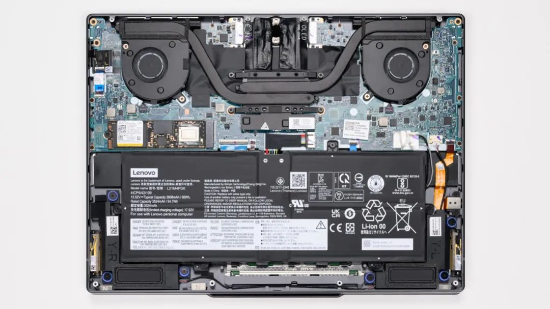 上图是ThinkBook Plus Twist的拆机实拍图,双风扇双热管的组合,核显轻薄本常见的布局。