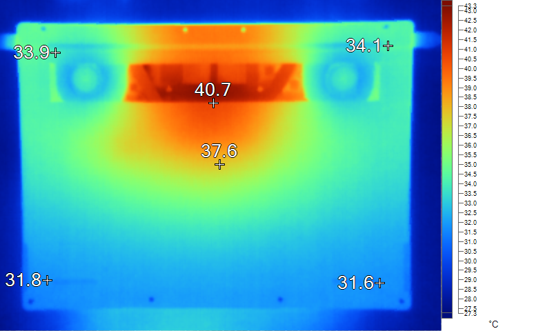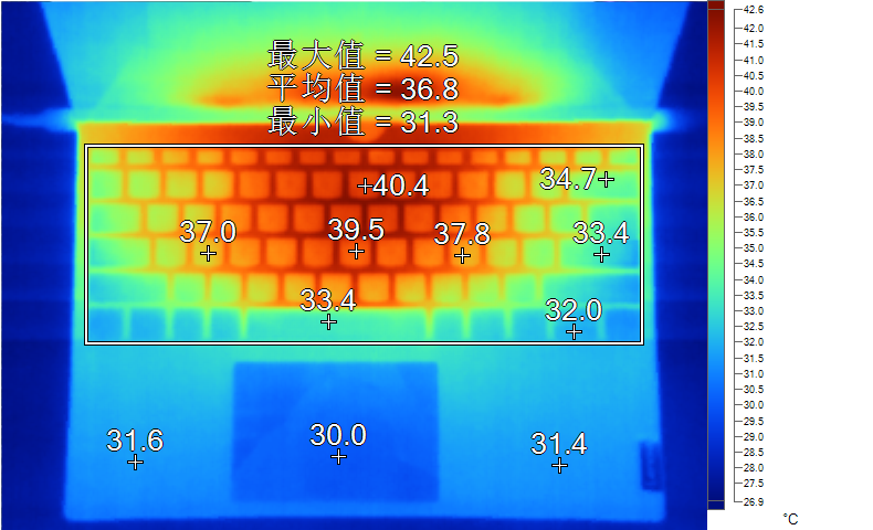 表面温度如上图所示,键盘键帽最高40.4℃出现在数字键“7”处,WASD键为37.0℃,方向键32.0℃。左腕托温度为31.6℃,背面中心点37.6℃。