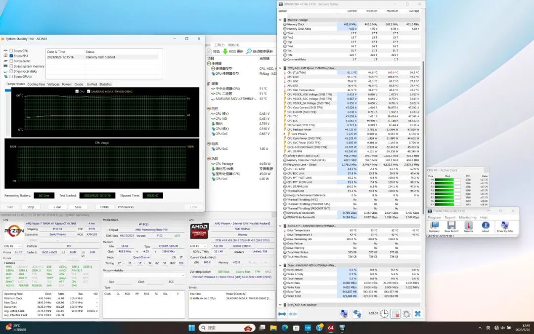 在满载状态下,开启性能模式,CPU温度最高100.0℃,稳定在91.1℃,功耗约45W,频率3.8GHz左右。