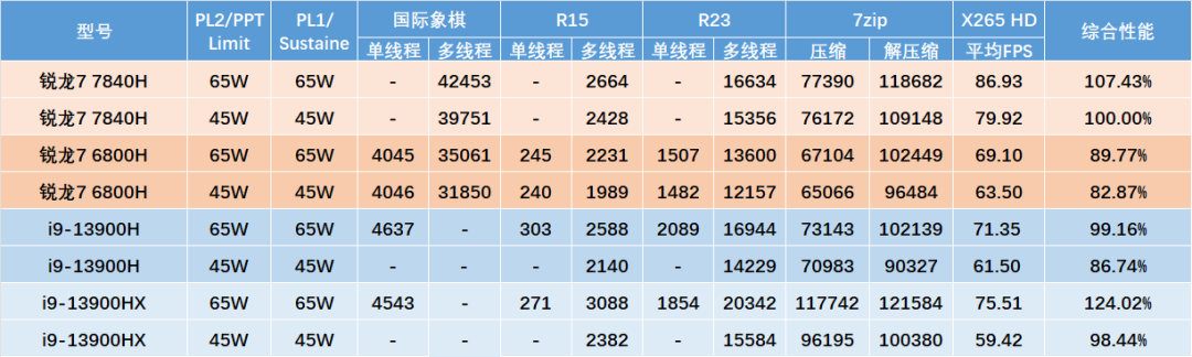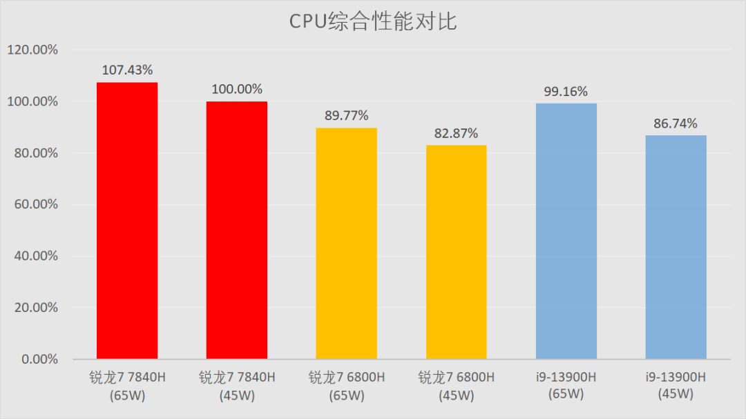 即使是面对Intel的13代i9-13900H处理器,锐龙7 7840H在45W功耗下即可与i9-13900H在65W下的成绩持平,由于积热等客观因素,AMD锐龙平台在笔记本上再给功耗,可能也不会得到更多提升了,因此我们主要关心它在65W及以下功耗的成绩表现。