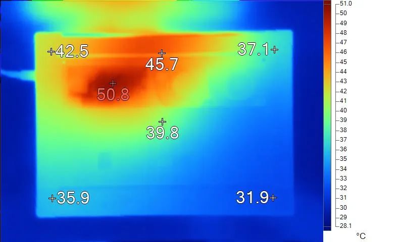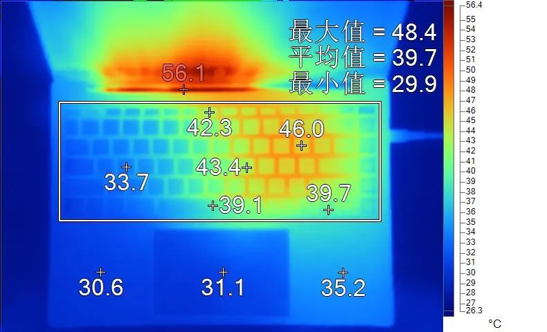 表面温度如上图所示,键盘键帽最高46.0℃出现在键盘右侧,WASD键为33.7℃,方向键39.7℃。左腕托温度为30.6℃,背面中心点39.8℃。