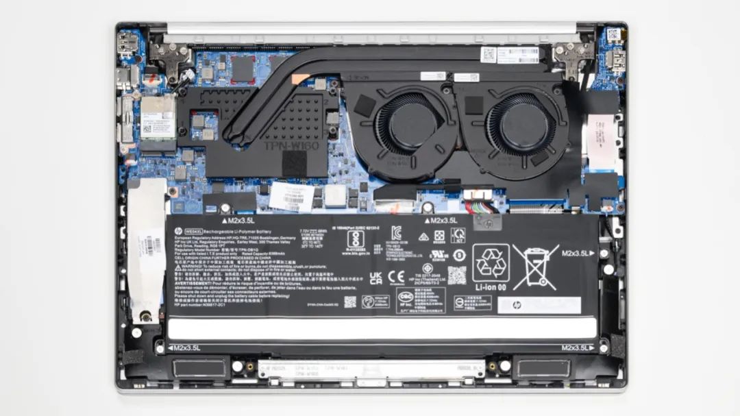 上图是惠普 锐Pro 14 锐龙版的拆机实拍图,双风扇双热管的组合。