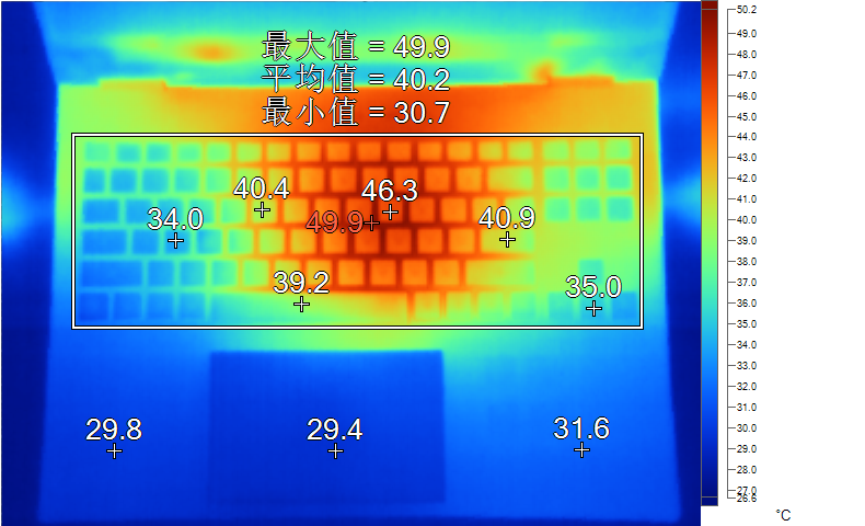 表面温度如上图所示,键盘键帽最高46.3℃出现在“O”键上,WASD键附近约为34.0℃,方向键35.0℃,左腕托温度为29.8℃。