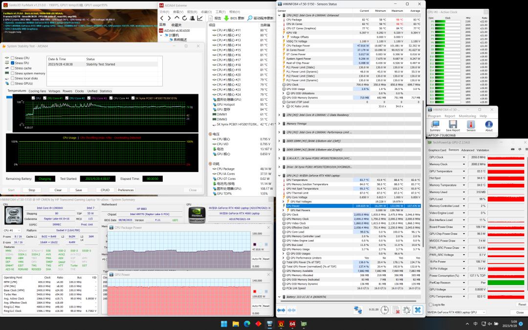 单烤Stress FPU,CPU温度维持在81℃,功耗90W,P核频率3.3GHz,E核频率2.6GHz,略微有些保守,作为HX55处理器,应该给到更高功耗。