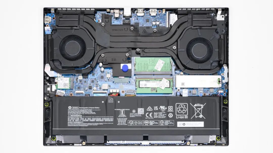 上图是OMEN 暗影精灵9 Slim的拆机实拍图,5热管双风扇的组合,其中一根热管隐藏在显卡底座背面。
