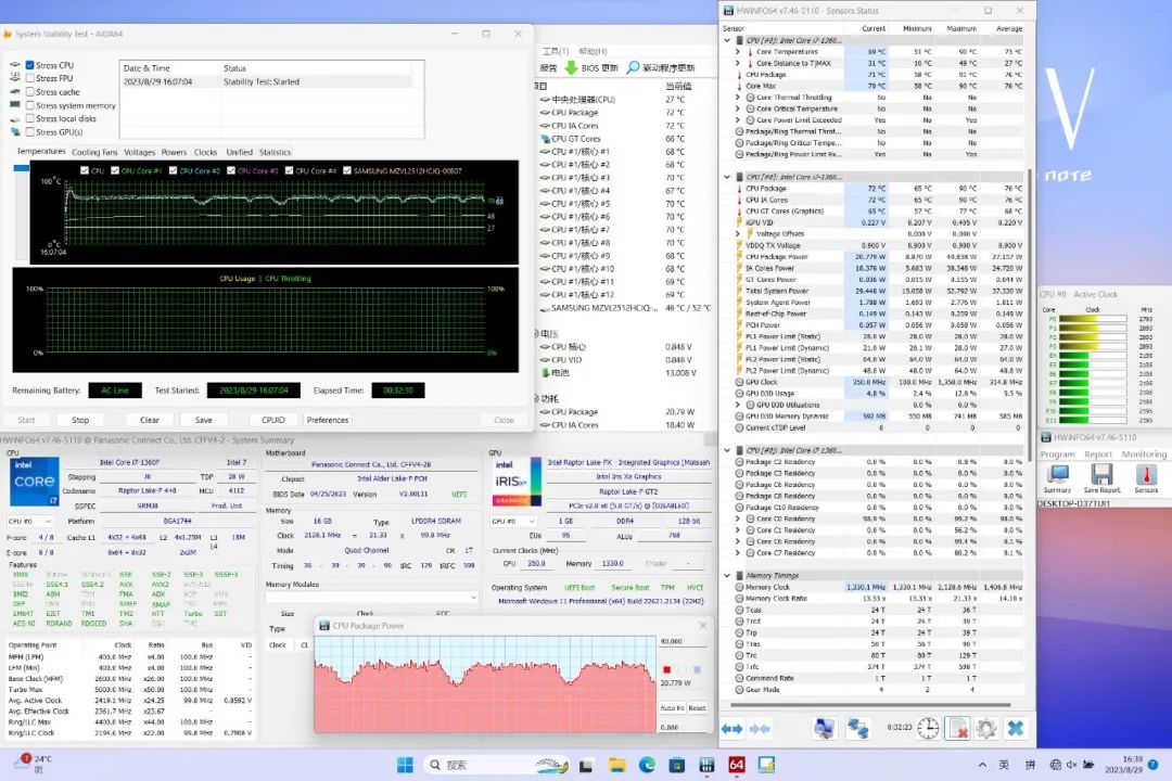 在满载状态下,CPU温度最高93℃,在72~77℃波动,功耗在20~28W之间波动,P核频率在2.8~3.3GHz波动,E核频率2.2~2.4GHz。