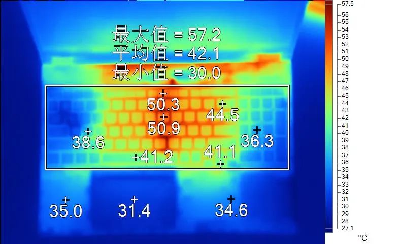 表面温度如上图所示,键盘键帽最高50.9℃出现在“I”键上,WASD键附近约为38.6℃,方向键41.1℃。左腕托温度为35.0℃。