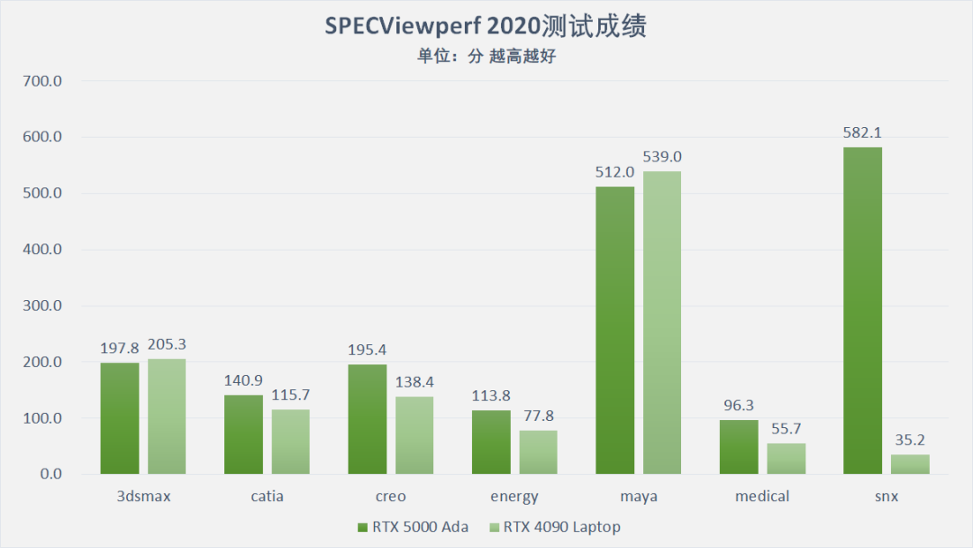针对这块移动端目前顶尖水平的专业图形卡,我们使用SPECViewperf 2020进行了专业软件性能测试,结果如下: