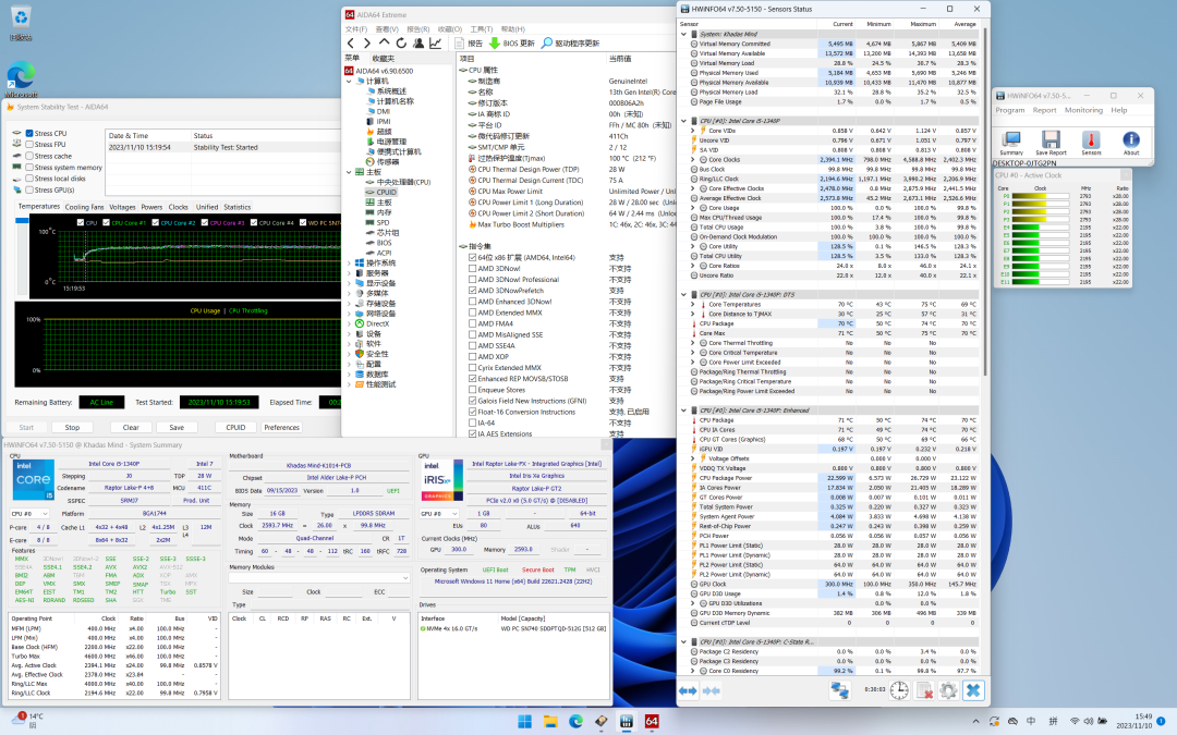 在满载状态下,在BIOS中切换Turbo Performance模式,CPU温度最高74℃,稳定在71℃,功耗23W左右,P核频率维持在2.8GHz,E核频率2.2GHz。