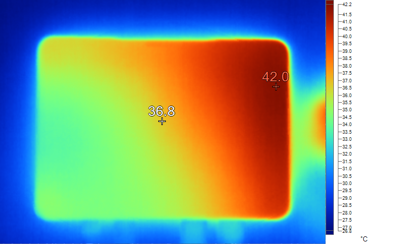 表面温度如上图所示,顶面最高温度为42.0℃,正面最高温度41.7℃。由于结构和尺寸问题,表面温度比普通的mini主机略高,属于正常现象。