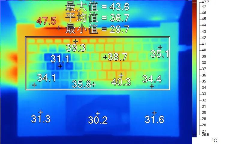表面温度如上图所示,键盘键帽最高40.3℃出现在键盘右下角区域,WASD键为31.1℃,方向键34.4℃。左腕托温度为31.3℃,背面中心点35.1℃。