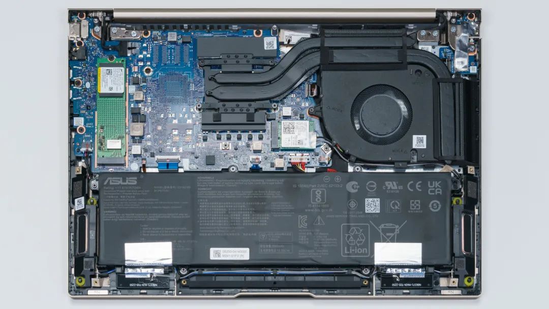 上图是华硕灵耀14 2023 旗舰版的拆机实拍图,单风扇双热管的组合。