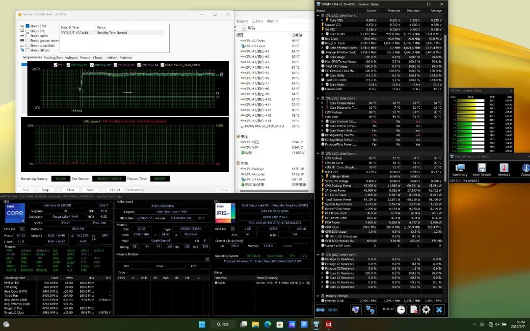 在满载状态下,开启高效模式,CPU温度最高94℃,稳定在89℃,功耗45W,P核频率维持在3.7GHz,E核频率2.9GHz。