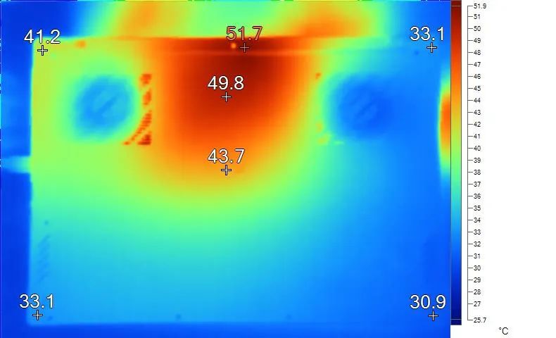 表面温度如上图所示,键盘键帽最高49.2℃出现在数字“7”键上,WASD键附近约为32.1℃,方向键34.5℃。左腕托温度为30.5℃,背面中心温度为43.7℃。