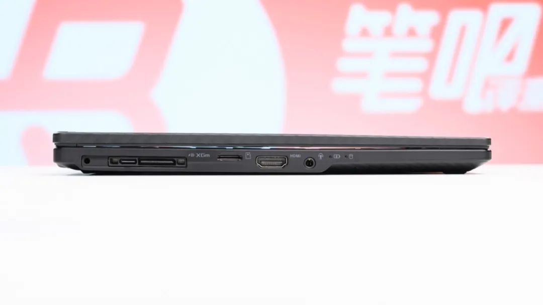 接口方面,机身左侧有一个XG Mobile扩展接口(包含USB-C 10Gbps,支持130W PD充电和DP核显视频输出)、MicroSD卡槽、HDMI2.1、3.5mm音频接口;