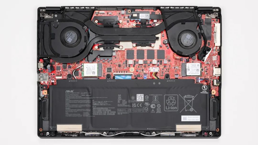 上图是ROG 幻13 2023的拆机实拍图,双热管双风扇的组合,CPU为液金导热。