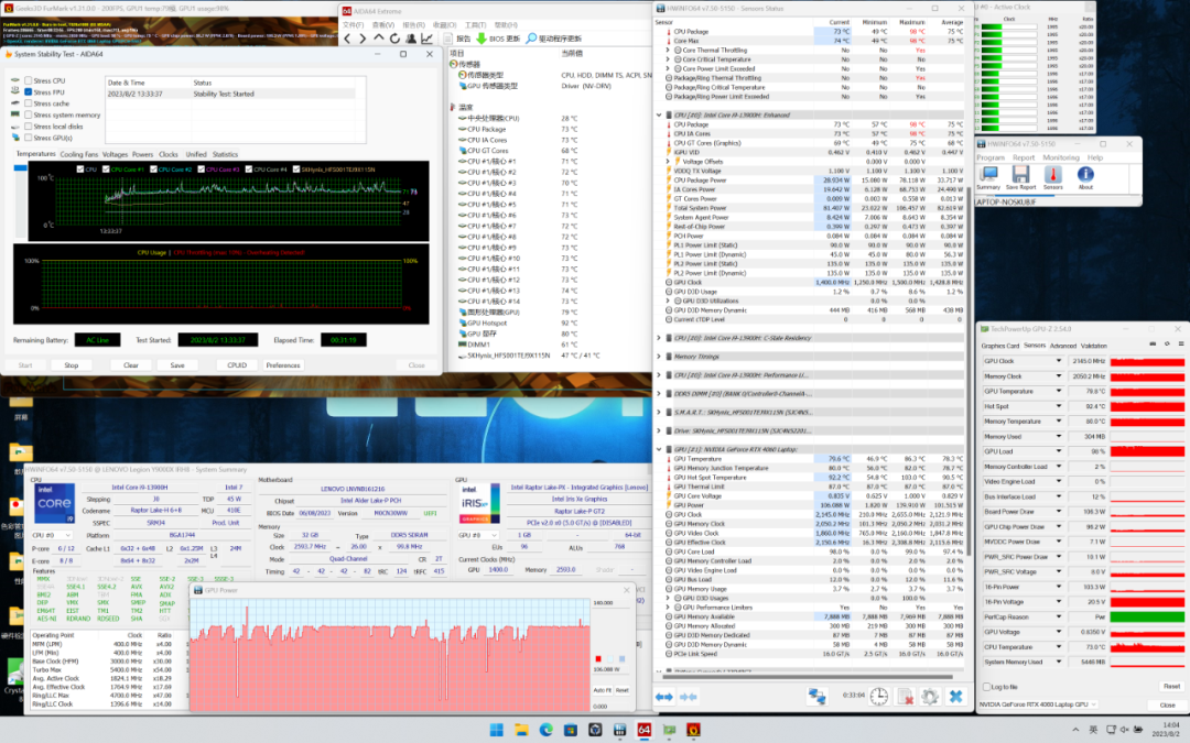 整机性能释放来到了165W,可以看到Y9000X这台机器核心散热一定程度上受到了进风量的限制,在踮起之后有较大的提升。