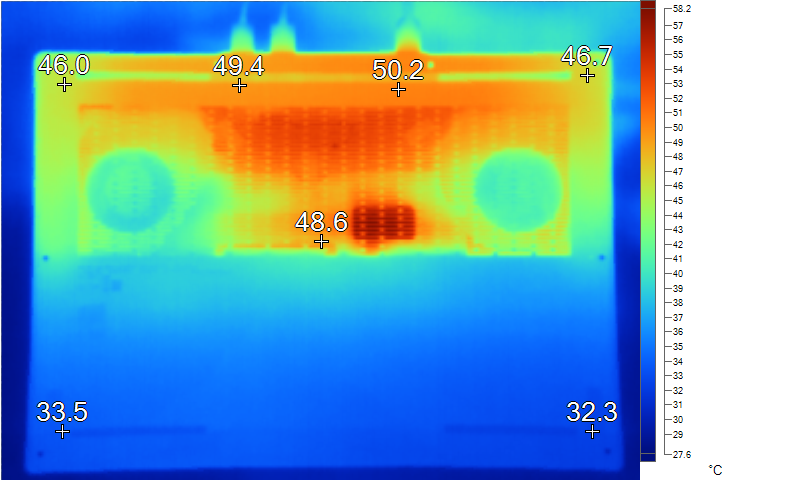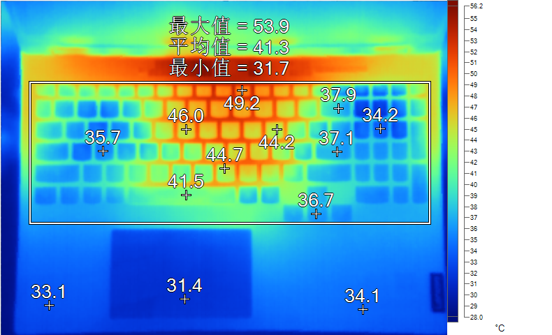 表面温度如上图所示,键盘键帽最高49.2℃出现在“F10”键上,WASD键附近约为35.7℃,方向键36.7℃。左腕托温度为33.1℃。