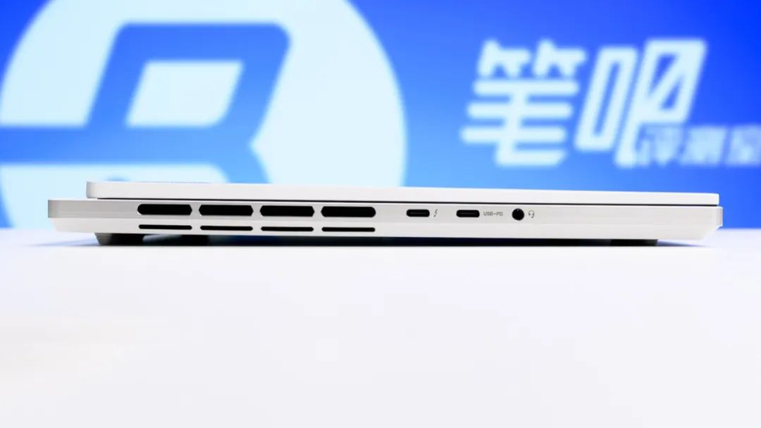 接口方面,机身左侧有一个雷电4(支持PD充电和DP核显输出)、一个USB-C 10Gbps(支持PD充电和DP独显输出);