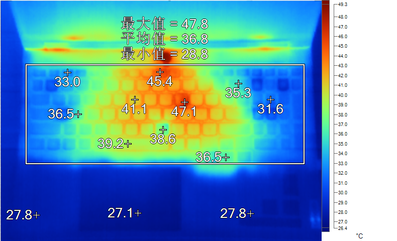 表面温度如上图所示,键盘键帽最高47.1℃出现在“U”键上,WASD键附近约为36.5℃,方向键36.5℃,左腕托温度为27.8℃。