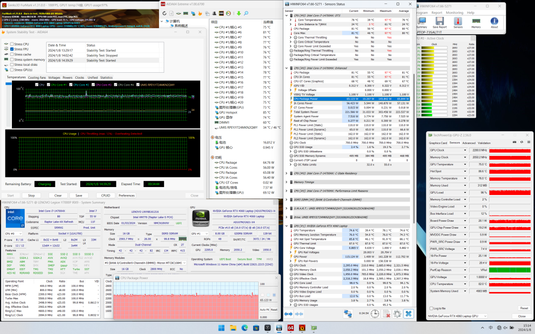 整机性能释放来到195W,从温度表现来看,功耗还有提升空间。