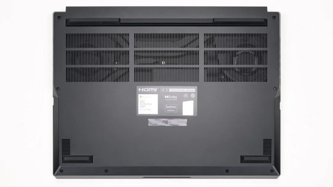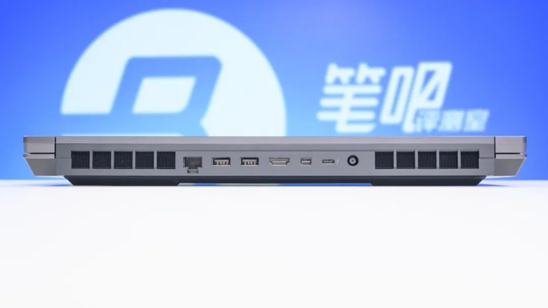机身后侧有一个雷电4(支持PD100W充电+DP1.4核显输出)、miniDP1.4(独显输出)、HDMI2.1(独显输出)、两个USB-A 10Gbps以及RJ-45网线接口。
