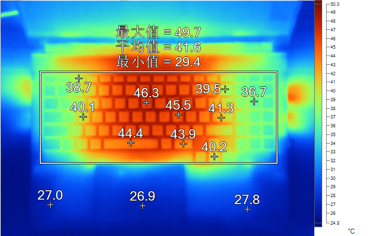 表面温度如上图所示,键盘键帽最高46.3℃出现在“U”键上,WASD键附近约为40.1℃,方向键40.2℃。左腕托温度为27℃。