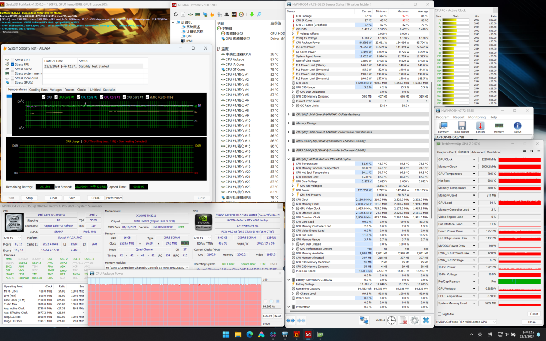 在满载状态下,开启狂暴模式,CPU温度最高97℃,稳定在87℃左右,功耗85W,P核频率3.0~3.1GHz,E核2.6GHz;