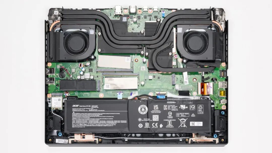 上图是宏碁 暗影骑士·龙16的拆机实拍图,五热管双风扇的组合。